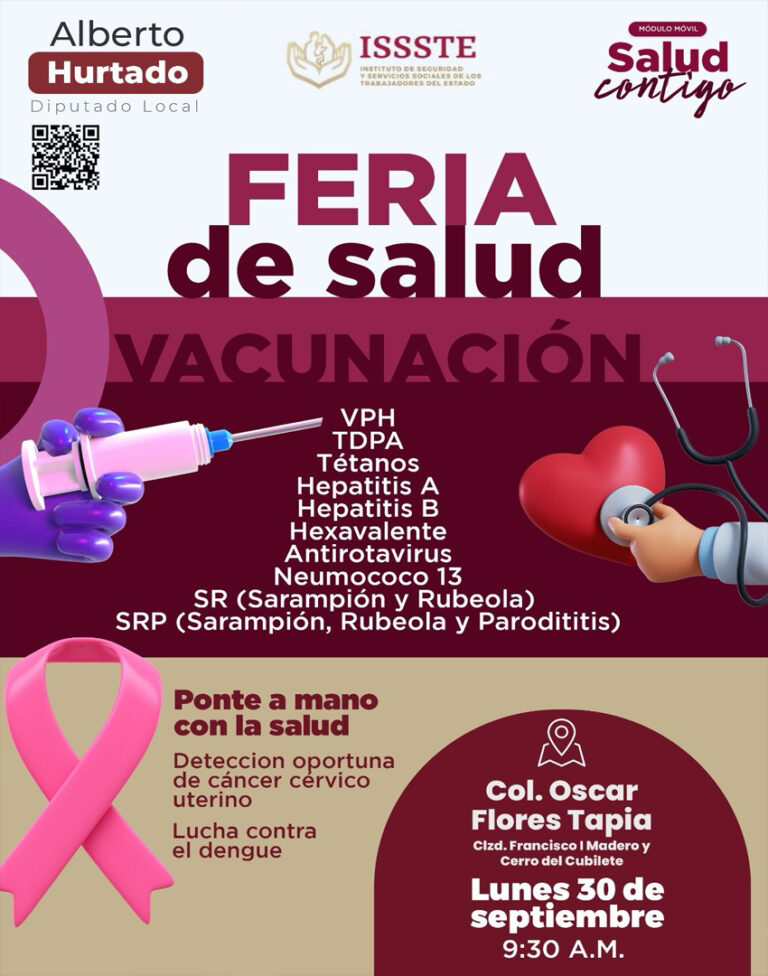 El diputado local de MORENA, Alberto Hurtado, lidera la iniciativa que ofrecerá vacunación y servicios de salud en la colonia «Salud Contigo» de Alberto Hurtado llevará Feria de Salud y Vacunación a colonia "Oscar Flores Tapia" este lunes 29 de julio. El próximo 30 de septiembre, el Módulo Móvil ... Leer Más