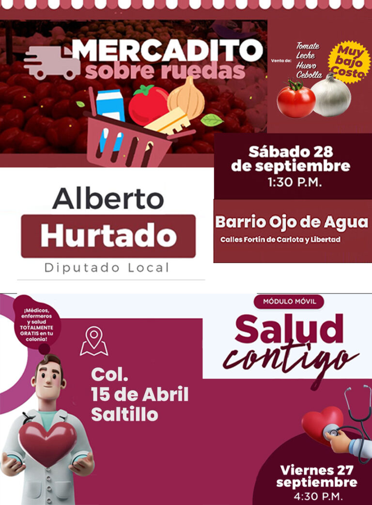 El Programa de Salud Contigo, dedicado a acercar servicios médicos y medicamentos a las colonias más necesitadas de Saltillo hoy estará prestando sus servicios en: … como siempre bajo el mando de Alberto Hurtado, diputado de MORENA ... Leer Más