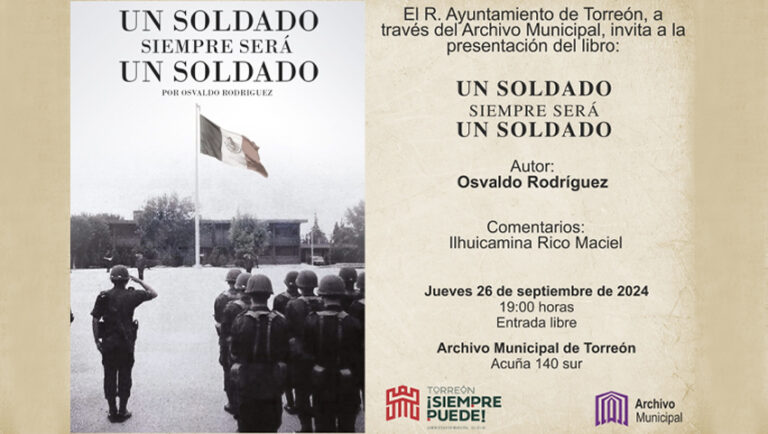 Torreón, Coahuila. A 24 de septiembre de 2024. El Archivo Municipal de Torreón tiene para su próxima actividad la presentación del libro: “Un soldado siempre será un soldado”, escrito por Osvaldo Rodríguez, y que trata sobre la historia de un exmiembro del Ejercito mexicano. Cinthia Gaspar ... Leer Más