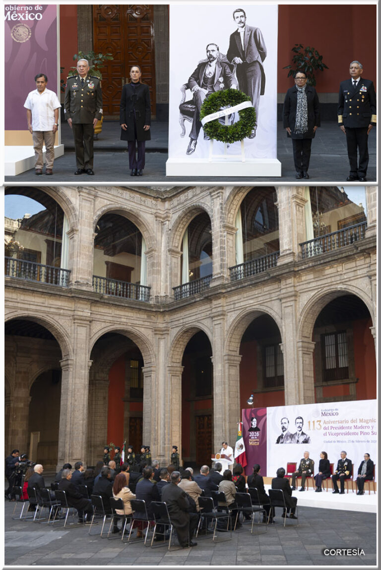 La Presidenta de México, Claudia Sheinbaum Pardo, encabezó la ceremonia por el 113 Aniversario del magnicidio del presidente Francisco I. Madero y del vicepresidente José María Pino Suárez en el Patio de Honor de Palacio Nacional. Como parte de la ceremonia, la Jefa del Ejecutivo Federal; la ... Leer Más