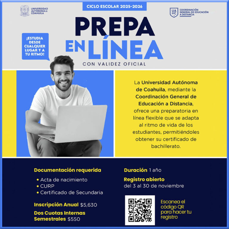 SALTILLO, Coahuila. 14 de noviembre de 2025. La Universidad Autónoma de Coahuila a través de la Coordinación General de Educación a Distancia, ofrece el Bachillerato en Línea, por lo que convoca a las personas interesadas a realizar su registro en la página ... Leer Más