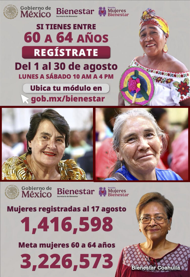 La Secretaría de Bienestar informó que hasta el 17 de agosto, la Pensión Mujeres Bienestar ha registrado a 1.4 millones de nuevas beneficiarias en todo el país, quienes se suman a más de un millón de mujeres que ya reciben este apoyo del Gobierno de ... Leer Más