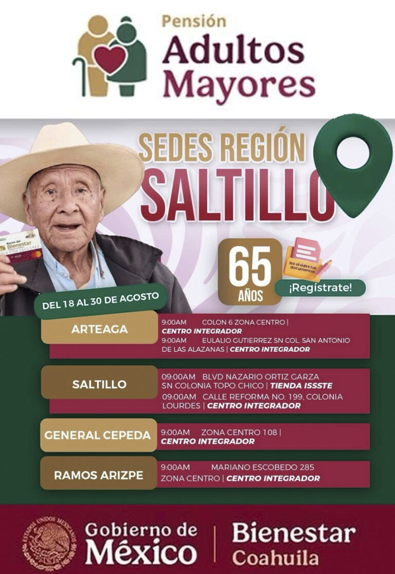 Anuncia Secretaría de Bienestar Coahuila registro para la Pensión de Adulto Mayor de 65 años y más.