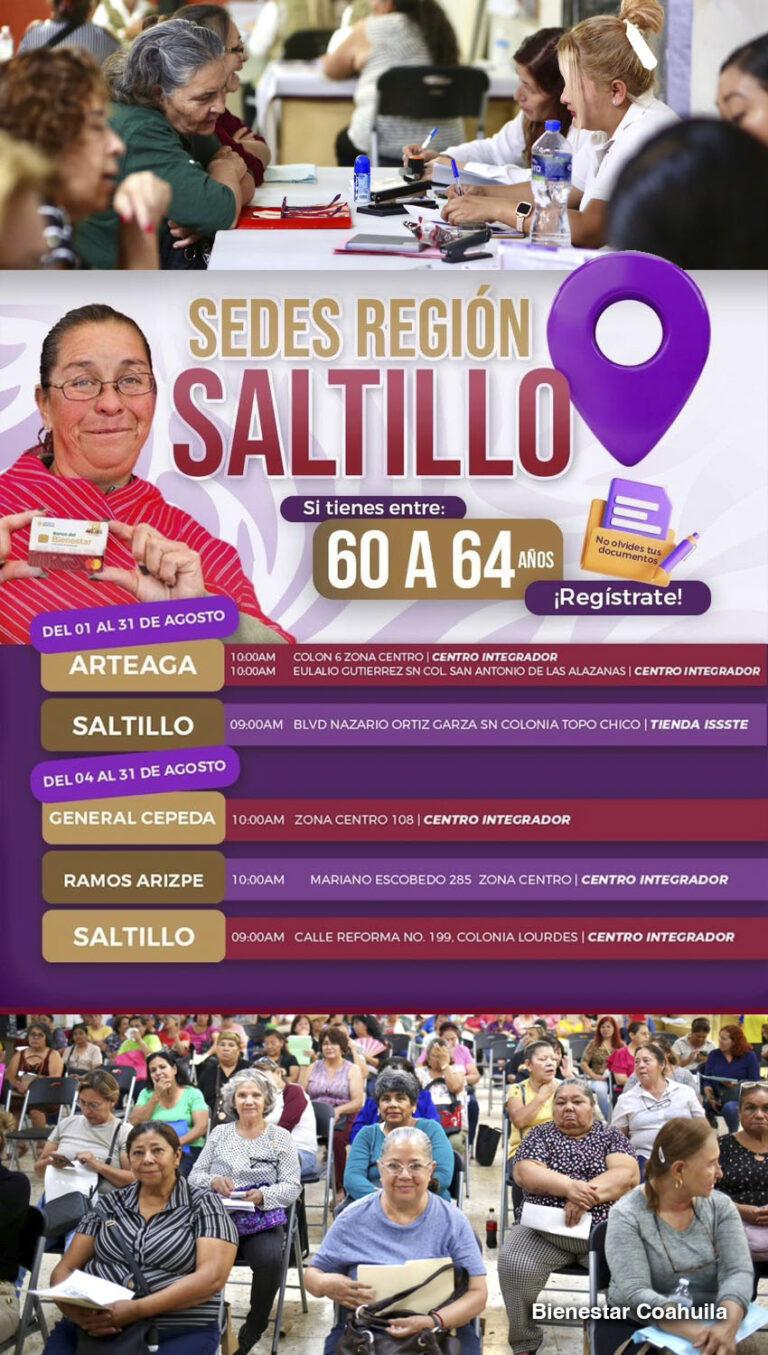 La Secretaría de Bienestar en Coahuila, a través del director regional Ossiel Ruiz, informa la apertura de un nuevo Centro Integrador en la ciudad de Saltillo, con el objetivo de facilitar el registro de mujeres de 60 a 64 años al programa Pensión Mujeres ... Leer Más