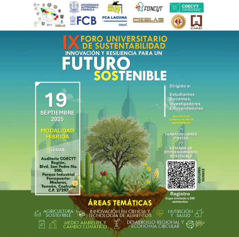 TORREÓN, Coahuila. 1 de agosto de 2025. La Universidad Autónoma de Coahuila a través de la Facultad de Ciencias Biológicas, llevará a cabo el 19 de septiembre de 2025 el IX Foro de Universitario de Sustentabilidad “Innovación y Resiliencia para un Futuro Sostenible”, de manera virtual y presencial ... Leer Más