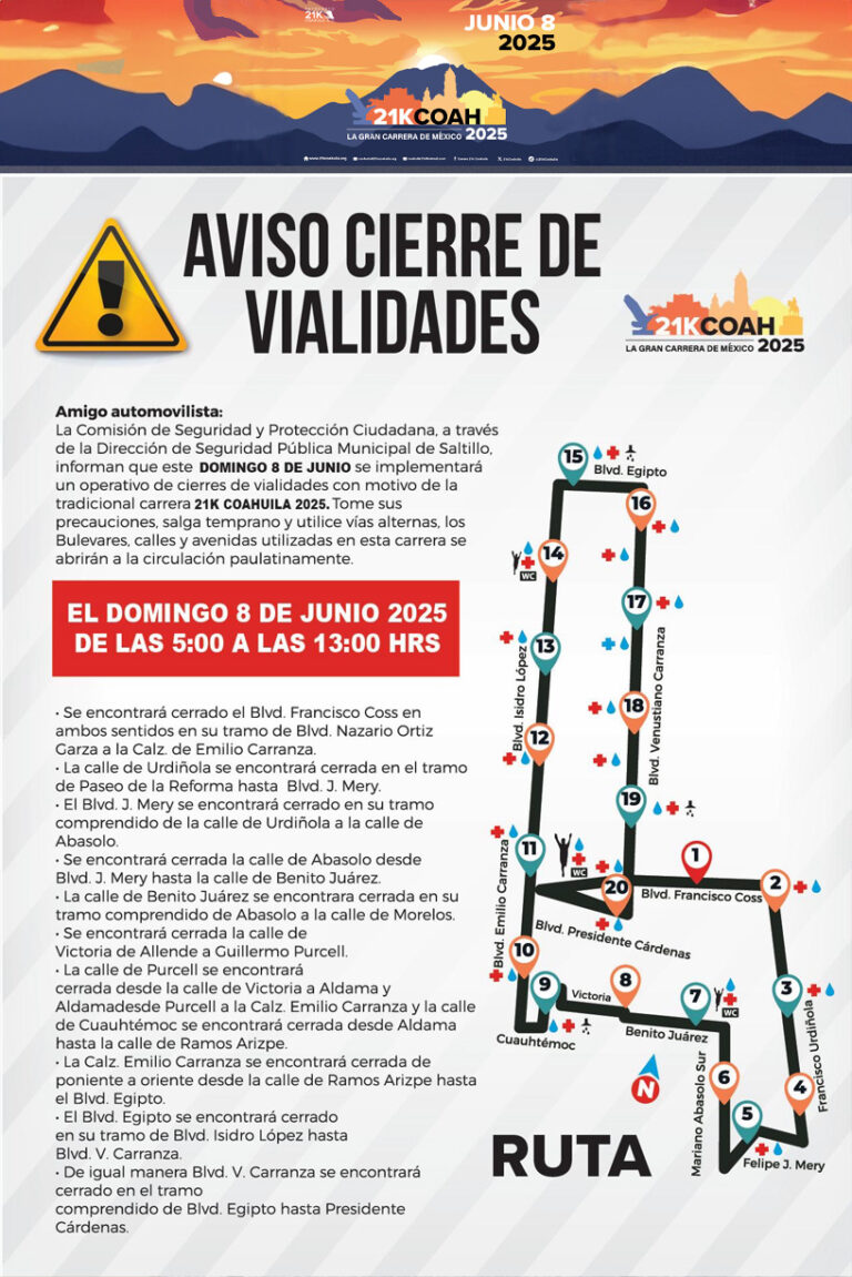 Cierres Viales por 21K Coahuila el 8 de Junio en Saltillo