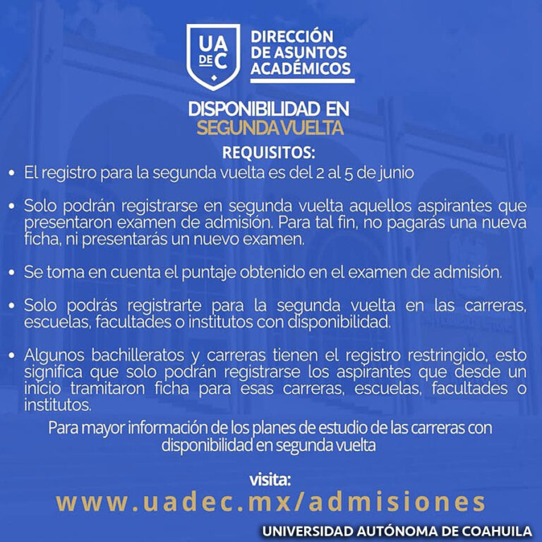 Abierto Registro para Nuevos Aspirantes La Universidad Autónoma de Coahuila (UAdeC) abre su segunda vuelta de admisión para estudiantes de nuevo ingreso a nivel bachillerato y licenciatura, con un registro que va del 2 al 5 de junio de 2025. Esta es una excelente oportunidad para aquellos que ... Leer Más
