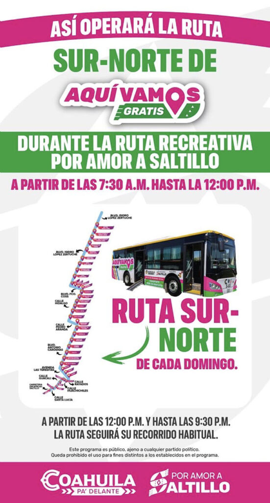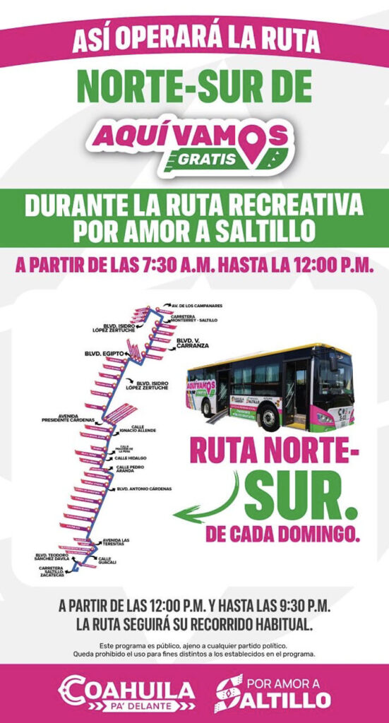El Gobierno Municipal de Saltillo ha informado sobre la modificación temporal en la operación de las rutas troncales gratuitas sur-norte y norte-sur del programa “Aquí Vamos Gratis” durante la realización de la Ruta Recreativa dominical. El ajuste busca mantener el servicio de transporte público mientras se realiza el cierre de vialidades.