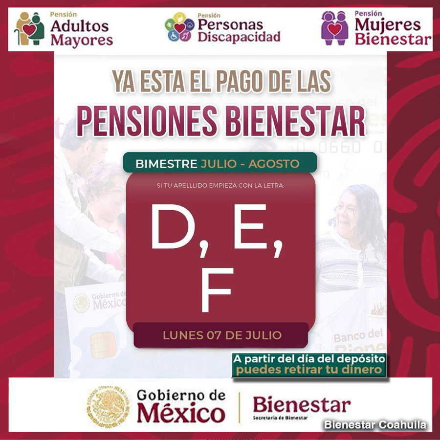 La Secretaría de Bienestar en Coahuila y el delegado estatal Américo Villarreal Santiago informan que las personas beneficiarias de la Pensión para el Bienestar, cuyo apellido inicia con la letras “D,E,F”, ya pueden cobrar su apoyo correspondiente al bimestre julio-agosto. Este apoyo es parte de ... Leer Más