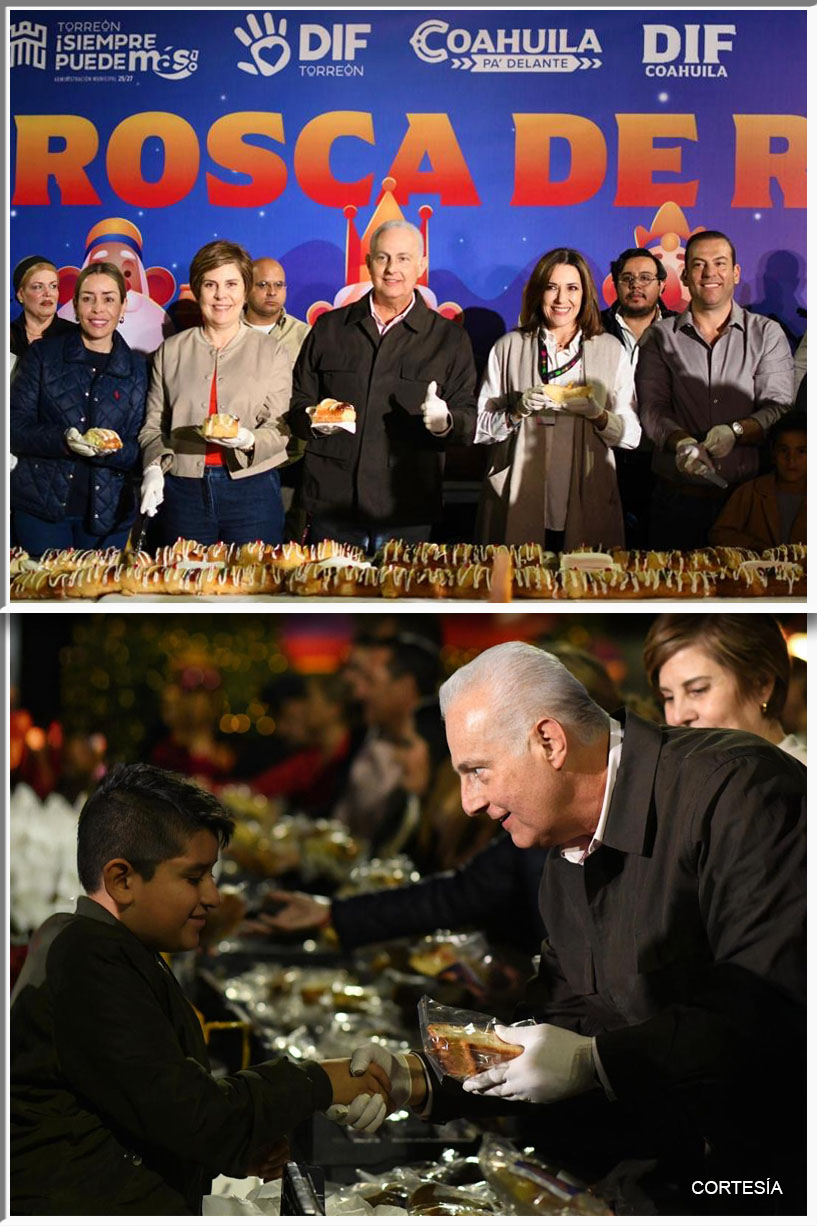 El alcalde Román Alberto Cepeda González, acompañado de la señora Selina Bremer de Cepeda, presidenta honoraria del DIF Torreón, así como de autoridades municipales y estatales, compartió la tradicional Mega Rosca de Reyes con 15 mil personas en la explanada de la Plaza ... Leer Más