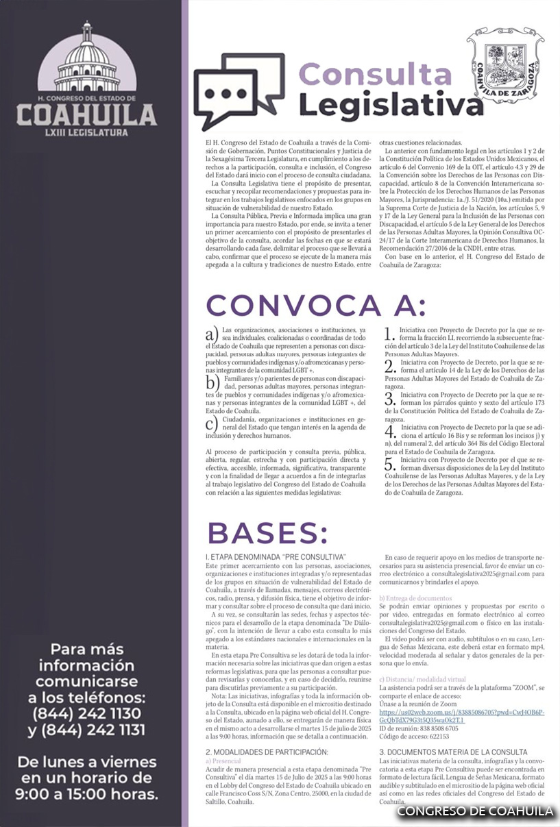 Saltillo, Coahuila, 9 de julio de 2025.- El Congreso del Estado de Coahuila emitió una convocatoria para participar en la Consulta Legislativa en materia de inclusión y derechos humanos, en la cual se convoca a representantes de grupos en situación de ... Leer Más