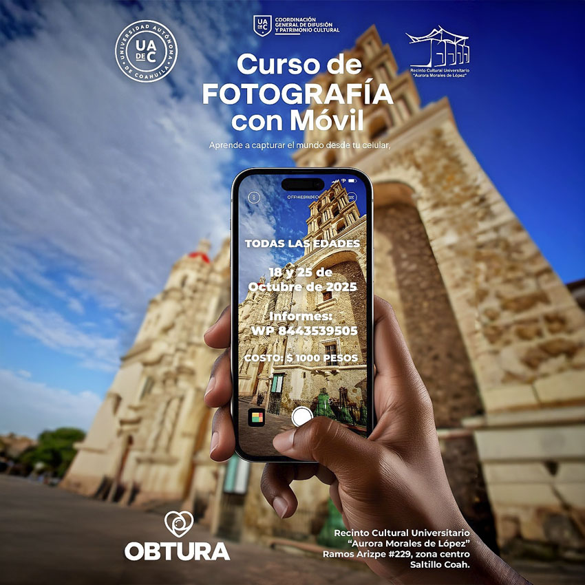 SALTILLO, Coahuila. 9 de octubre de 2025. La Universidad Autónoma de Coahuila, a través del Recinto Cultural Universitario “Aurora Morales de López”, invita a la comunidad universitaria y al público en general a participar en el “Curso de Fotografía con Móvil – Obtúra”, que se llevará a cabo los ... Leer Más