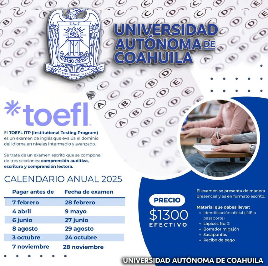 SALTILLO, Coahuila. 30 de julio de 2025. El Centro de Idiomas Unidad Sureste de la Universidad Autónoma de Coahuila, invita a presentar el Examen TOEFL Institutional Testing Program (ITP), el cual tiene como fechas de aplicación el 29 de agosto, 24 de octubre y 28 de noviembre de 2025. El examen ... Leer Más