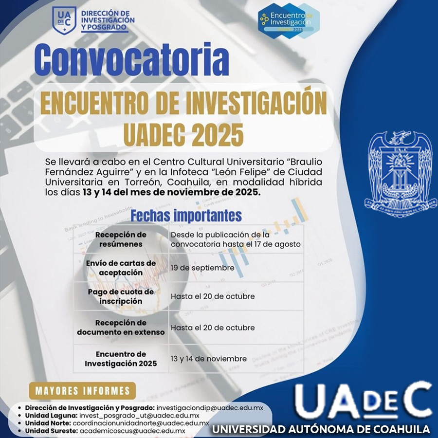 SALTILLO, Coahuila. 29 de mayo de 2025. La Universidad Autónoma de Coahuila a través de la Dirección de Investigación y Posgrado y las Coordinaciones de Unidad Sureste, Laguna y Norte, convoca al Encuentro de Investigación UAdeC 2025, que se llevará a cabo el 13 y 14 de noviembre de 2025 de manera ... Leer Más