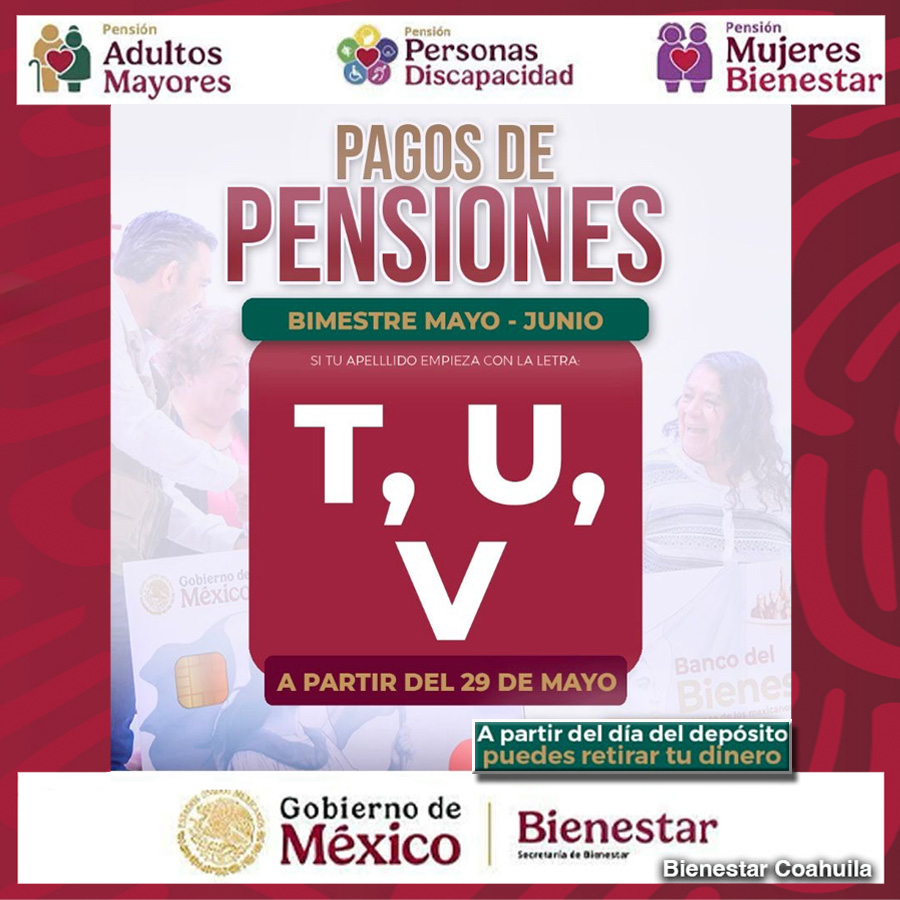La Delegación de Bienestar Coahuila y el Lic. Américo Villarreal Santiago informan que continúan hoy, 29 de mayo de 2025, las personas cuyo apellido paterno comience con la letra «T, U, V» ya pueden cobrar su pensión correspondiente al bimestre mayo-junio. Recuerda que el depósito se realiza ... Leer Más
