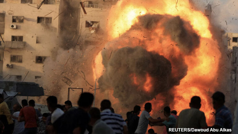 Palestinos corren mientras un edificio impactado por un ataque aéreo israelí se derrumba en la ciudad de Gaza.