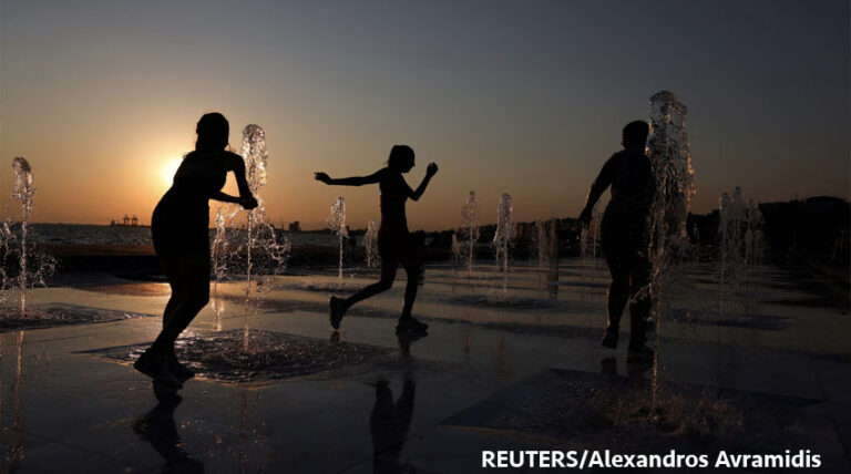 Jóvenes juegan en una fuente durante un día caluroso en Tesalónica, Grecia.