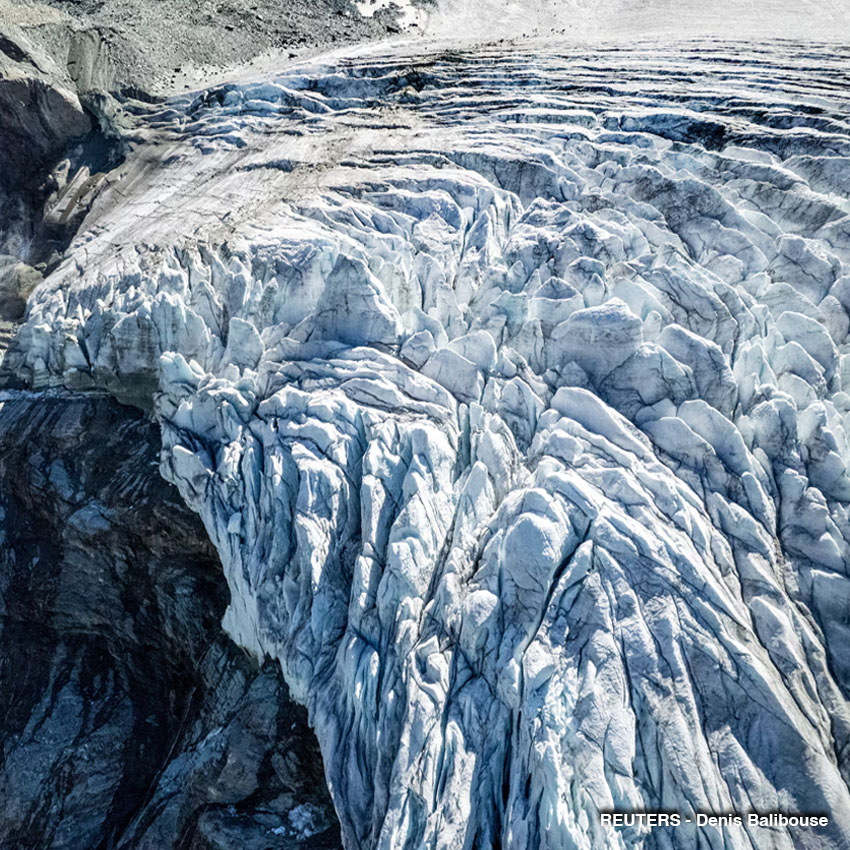 Una vista aérea muestra la ladera del glaciar Turtmann en medio del cambio climático, en Suiza