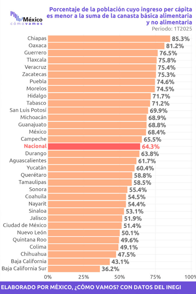 Al comparar el costo de la canasta alimentaria más no alimentaria con el ingreso laboral per cápita, en México, ¿cómo vamos? estimamos que en el primer trimestre de 2025, el 64.3% de la población nacional no tiene ingresos suficientes para adquirir la suma de las canastas alimentaria y no alimentaria. En dos estados el porcentaje de la población supera el 80%, siendo Chiapas la entidad con mayor proporción de su población sin ingresos suficientes para cubrir la suma de las canastas.