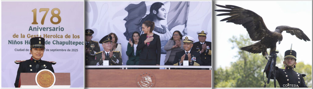 La Jefa del Ejecutivo Federal, realizó el pase de lista de honor a los Niños Héroes de Chapultepec quienes el 13 de septiembre de 1847, con valentía, defendieron a la patria de la invasión estadounidense: cadetes del Heroico Colegio Militar, Juan de la Barrera, Juan Escutia, Agustín Melgar, Vicente Suárez, Fernando Montes de Oca y Francisco Márquez, así como a los héroes de 1914 de la Heroica Escuela Naval Militar: tenientes José Azueta y Virgilio Uribe.